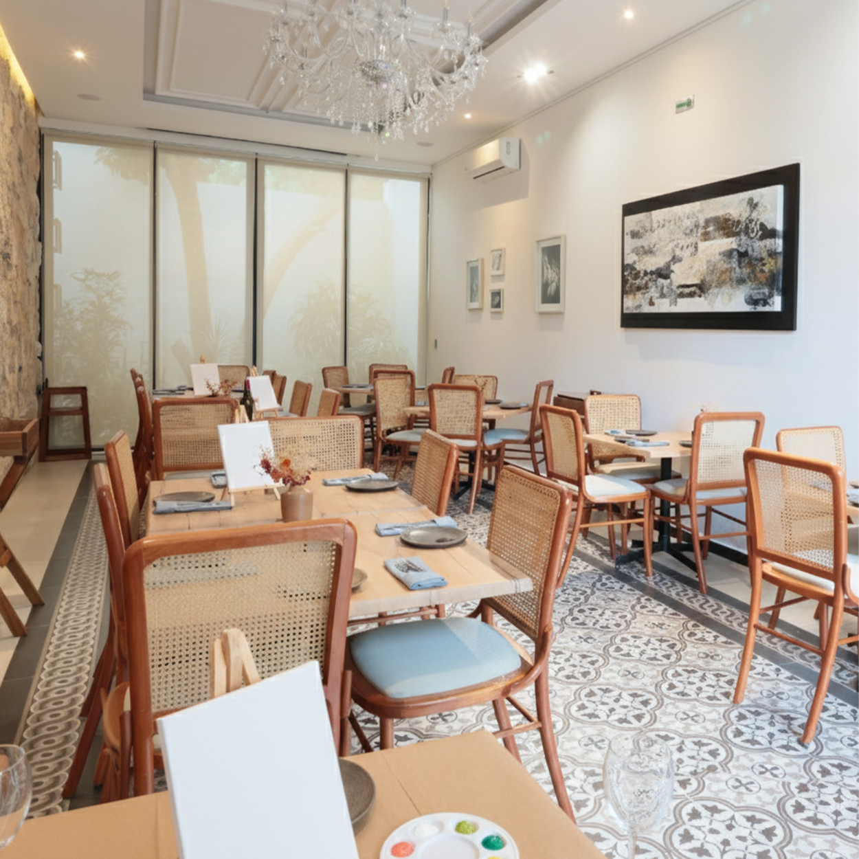 El encuentro comienza alrededor de la mesa y se convierte en un espacio creativo compartido, donde los sabores inspiran, la conversación fluye y la pintura se vive como forma de expresión juntos.